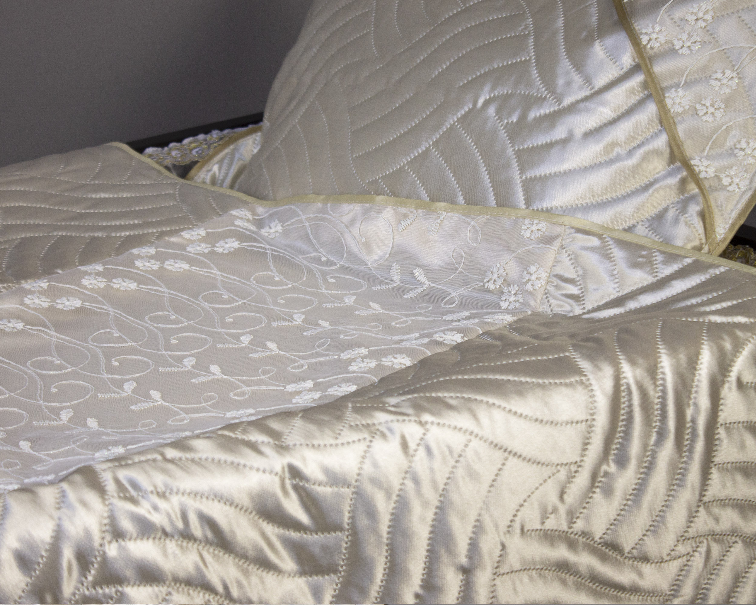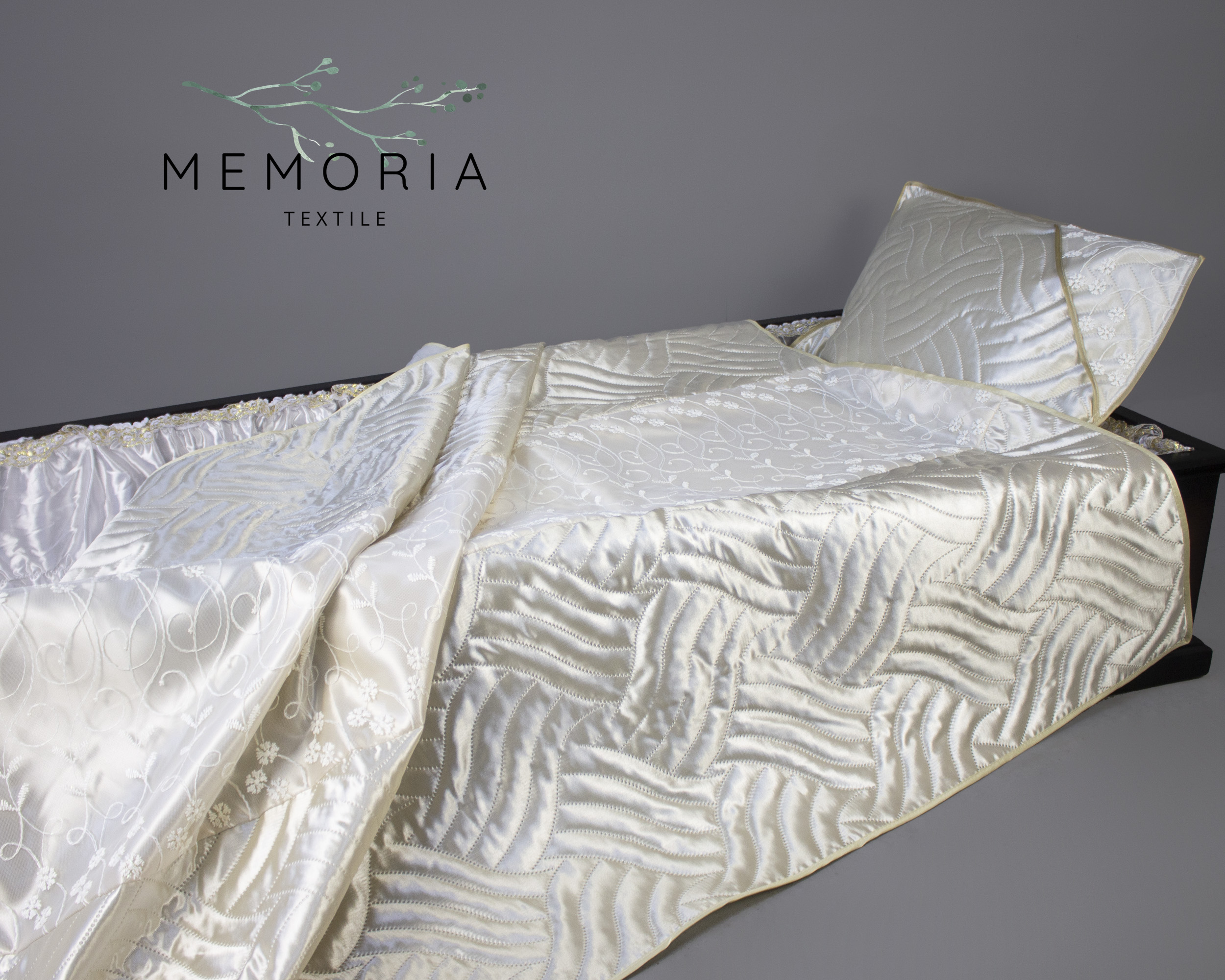 Комплект в гроб из атласной стежки со вставкой из вышивки на сетке. Покрывало и наволочка по периметру с атласной косой бейкой в тон.