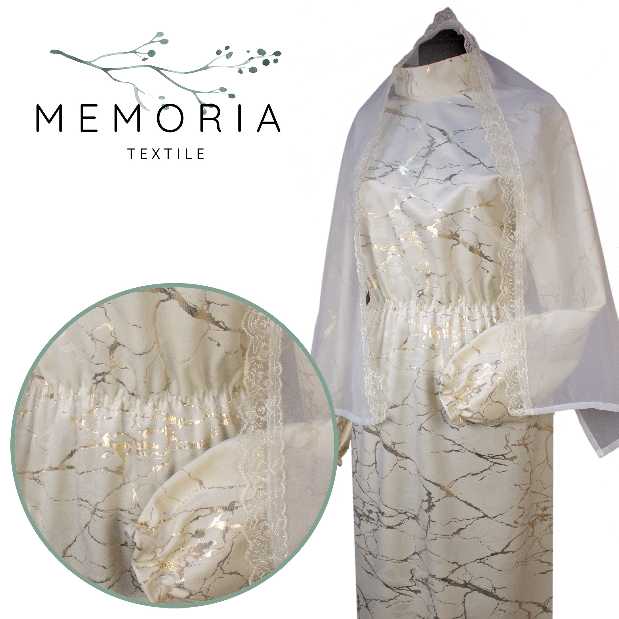Платье женское погребальное выполнено из бархатной ткани премиум-класса с эффектом мрамора с золотыми прожилками, с резинкой на талии и манжетах рукавов. Застежка - кнопки/липы на спине.