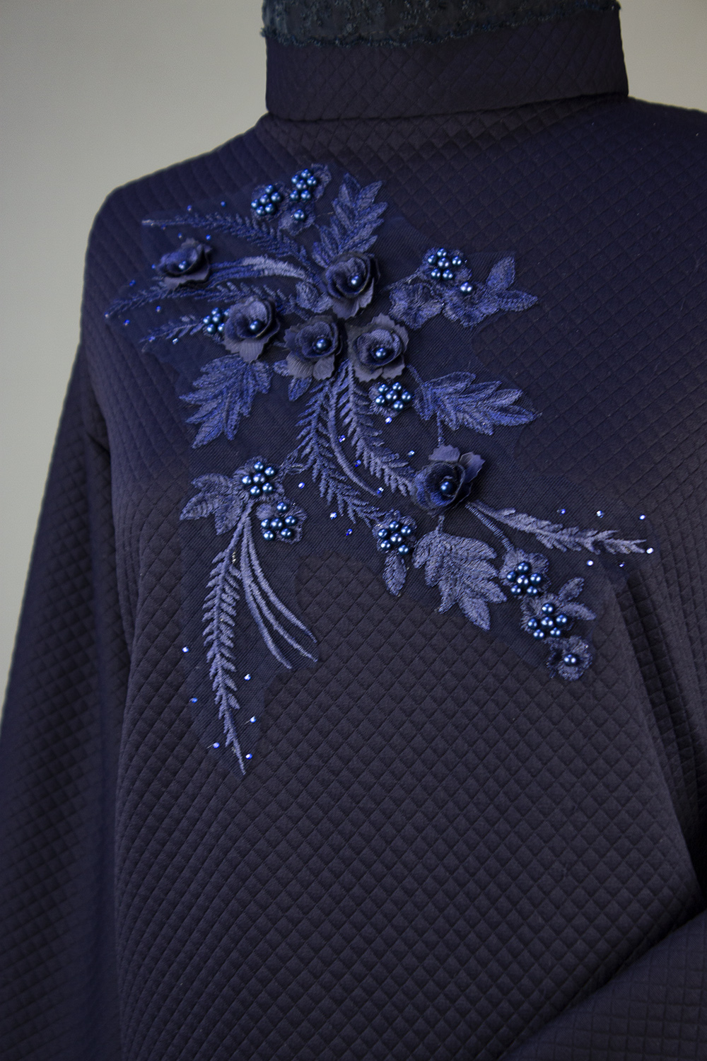 Платье прямого силуэта из трикотажа премиум-класса,  с отделкой кружевом в тон и 3D- аппликацией вышивкой с жемчугом.