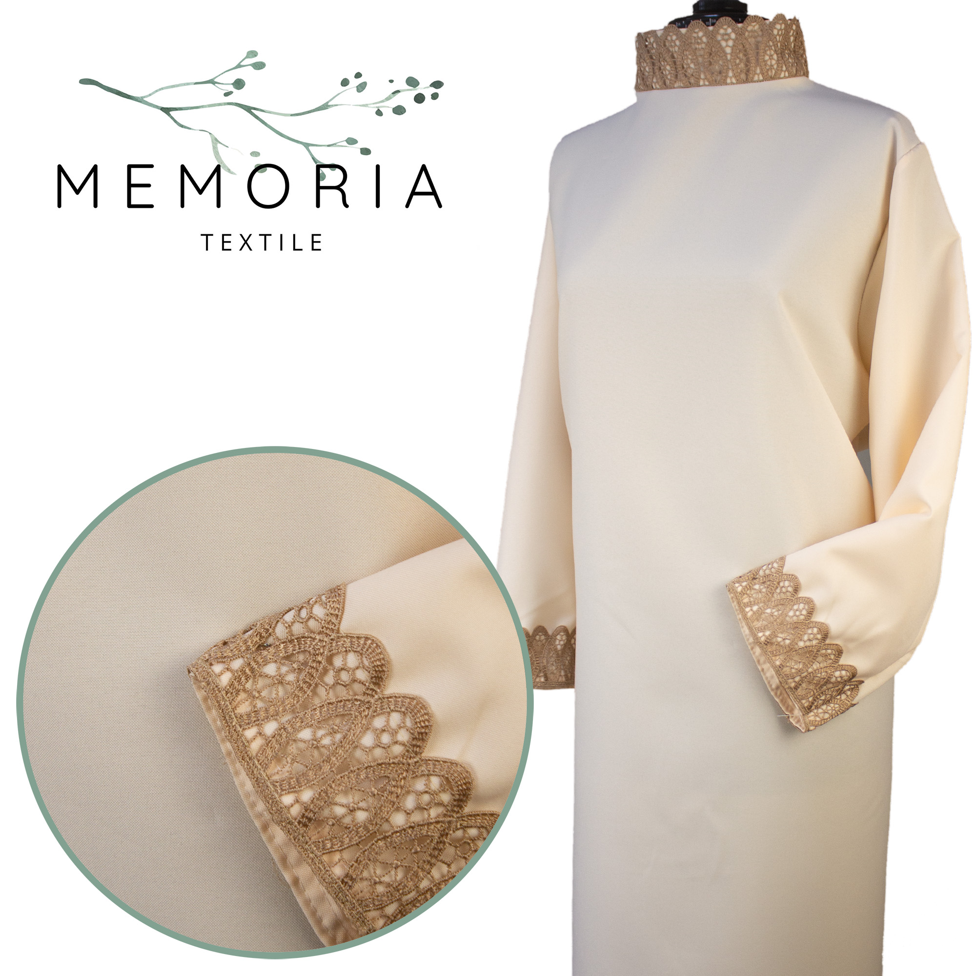Платье прямого силуэта, неотрезное по линии талии, без пояса, с заниженной линией пройм. Спинка со средним швом. Застежка на спине на велкро-ленту. Воротник – стойка. Декор – вязаное кружево по вороту и рукавам. Низ платья обработан швом с закрытым срезом.
