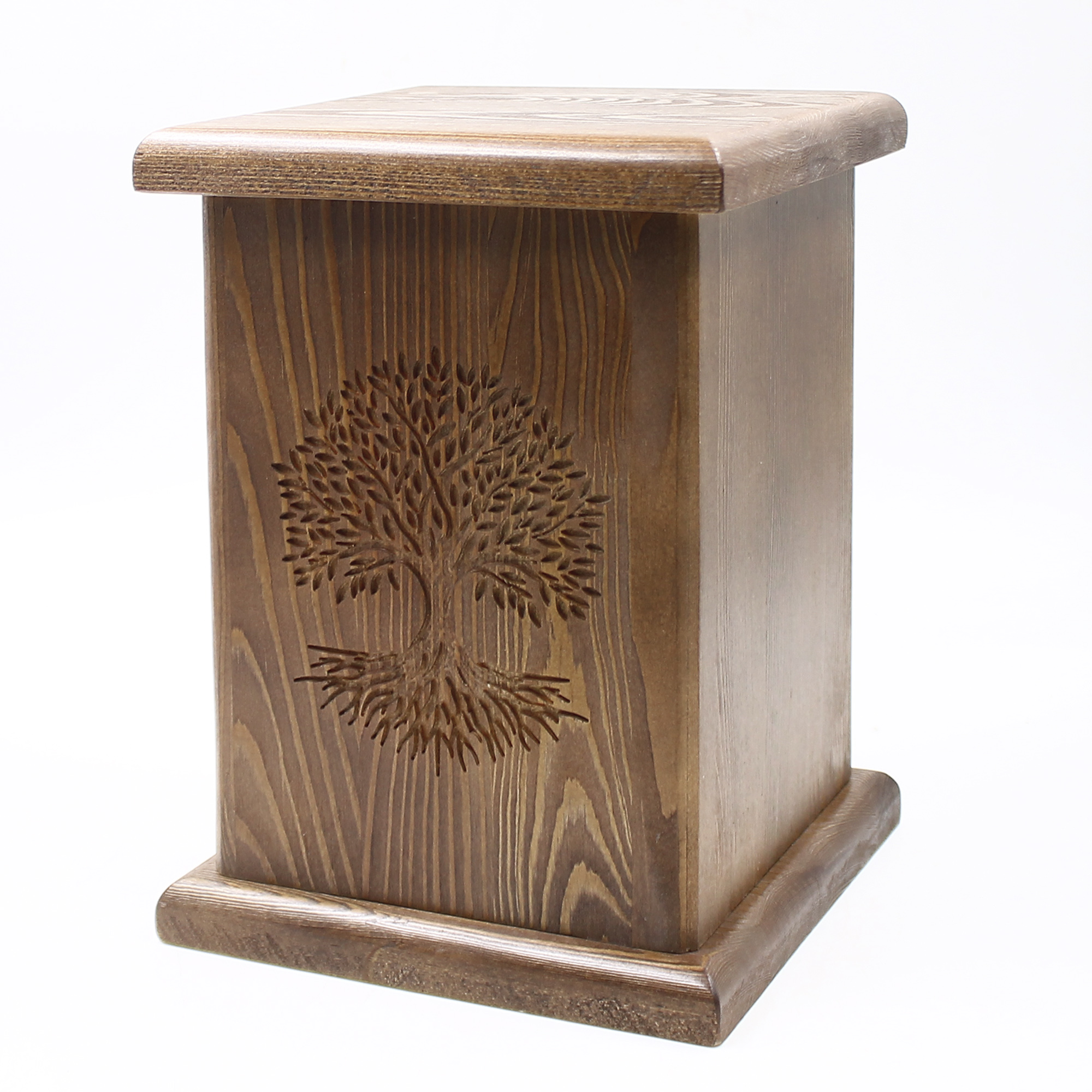 Урна для праха из натурального дуба в форме прямоугольной колонны с декоративной гравировкой "Дерево".