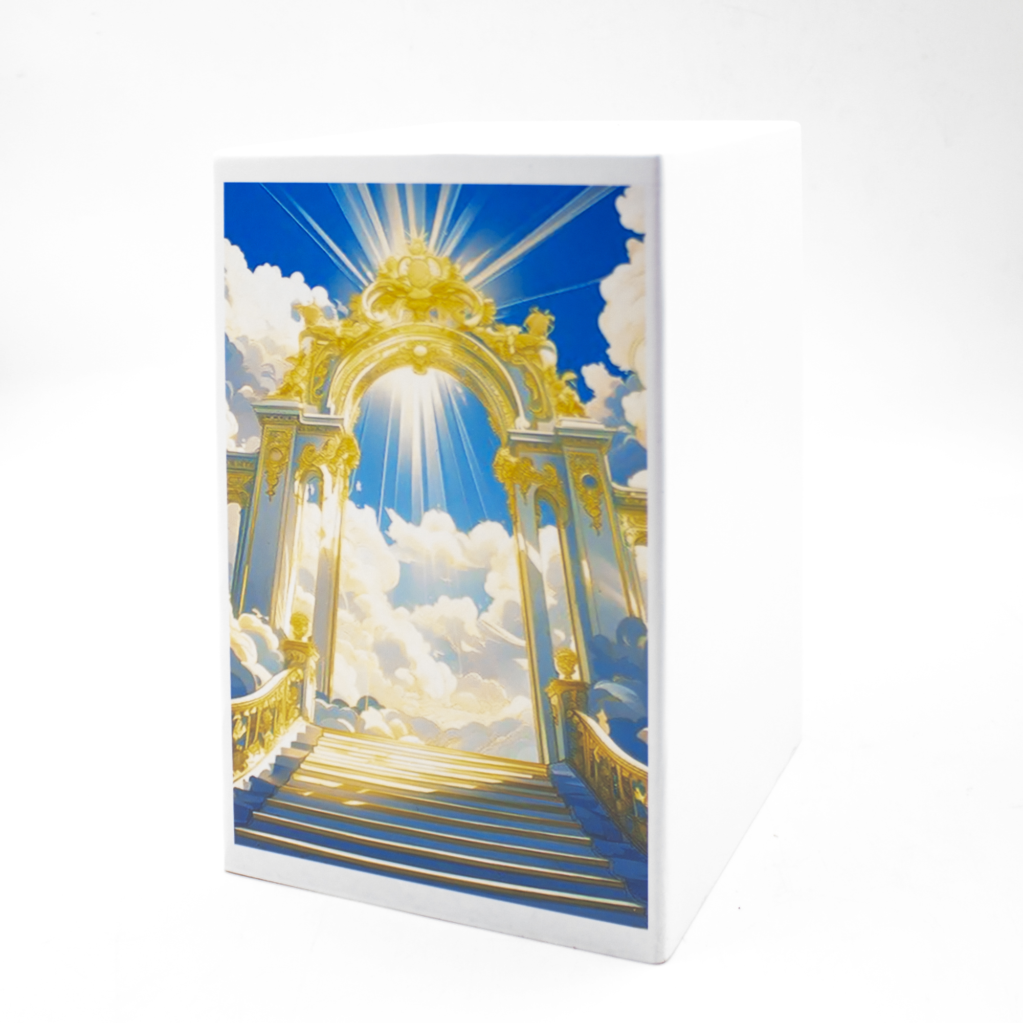 Урна для праха из МДФ в форме прямоугольной колонны с декоративной цветной печатью.