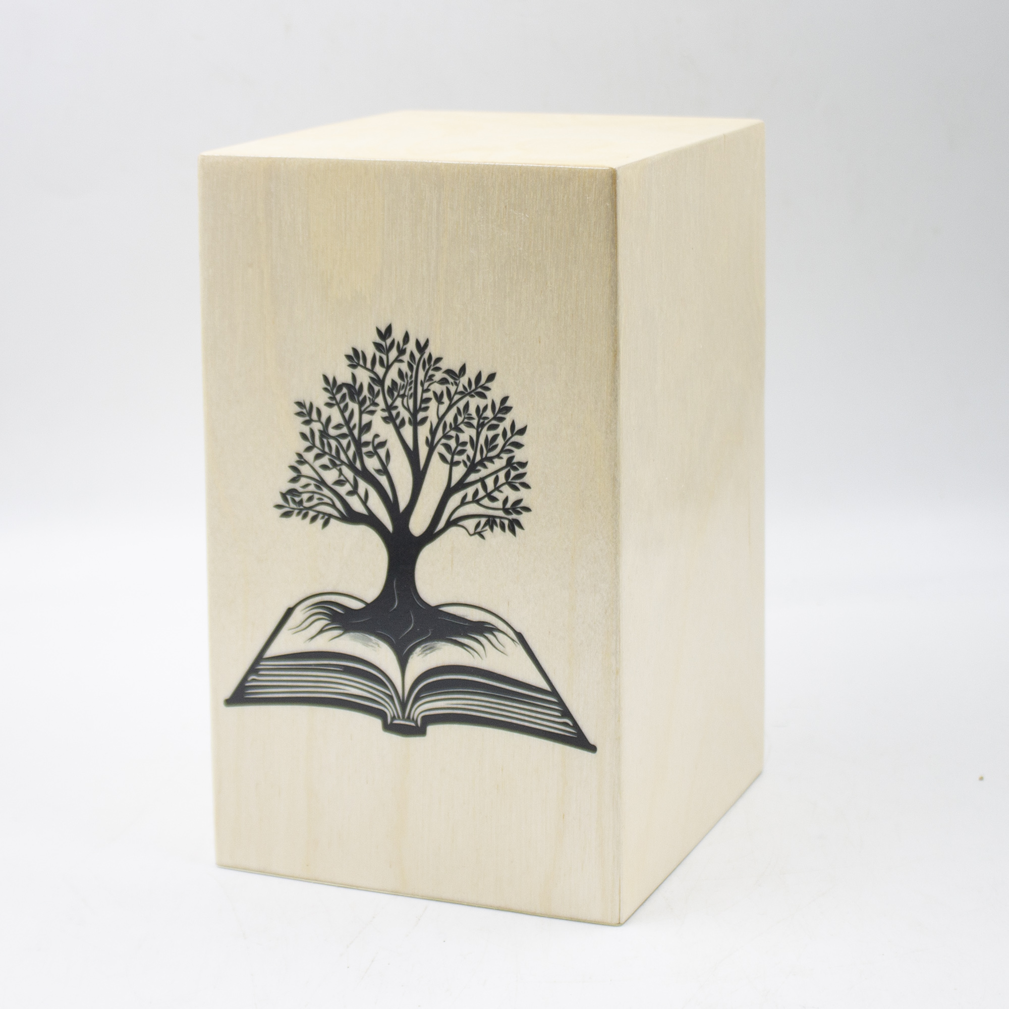 Урна для праха из натурального дерева в форме прямоугольной колонны с декоративной печатью "Дерево и книга".