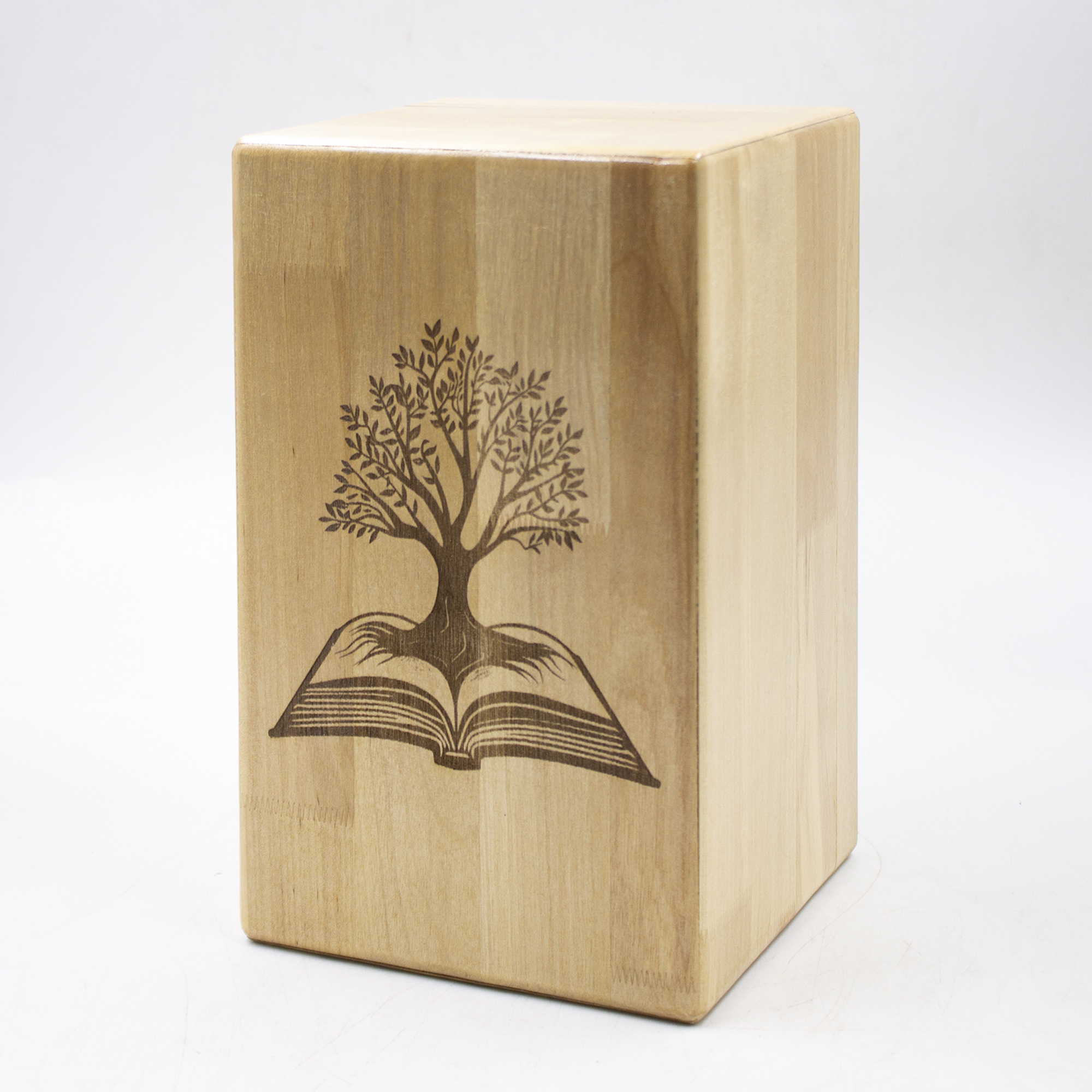 Урна для праха из натурального дерева в форме прямоугольной колонны с декоративной гравировкой "Дерево и книга".