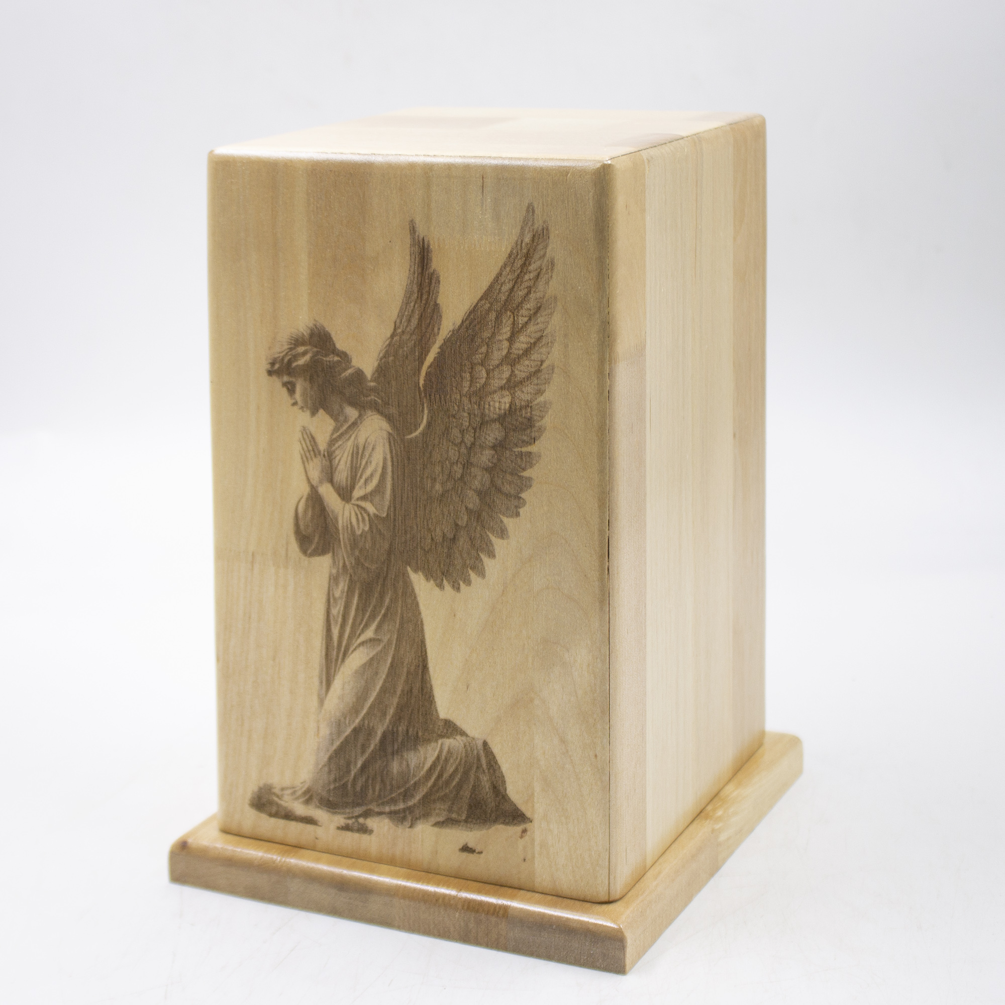 Урна для праха из натурального дерева в форме прямоугольной колонны с декоративной гравировкой "Скорбящий ангел".
