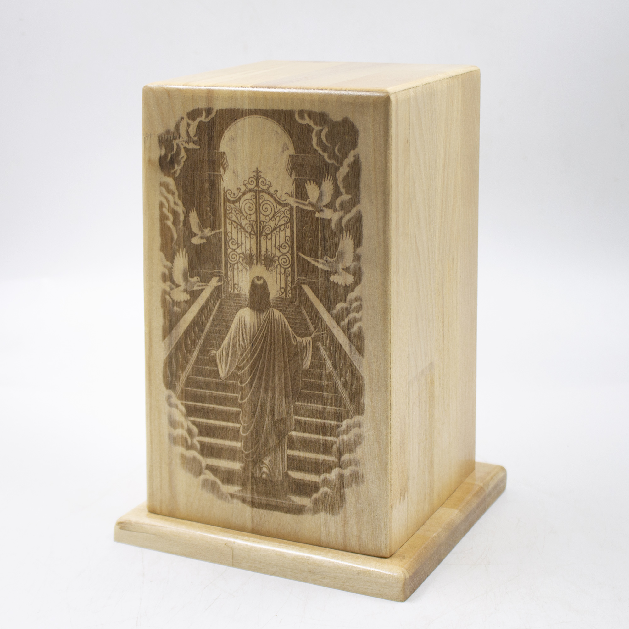 Урна для праха из натурального дерева в форме прямоугольной колонны с декоративной гравировкой "Райские Врата".