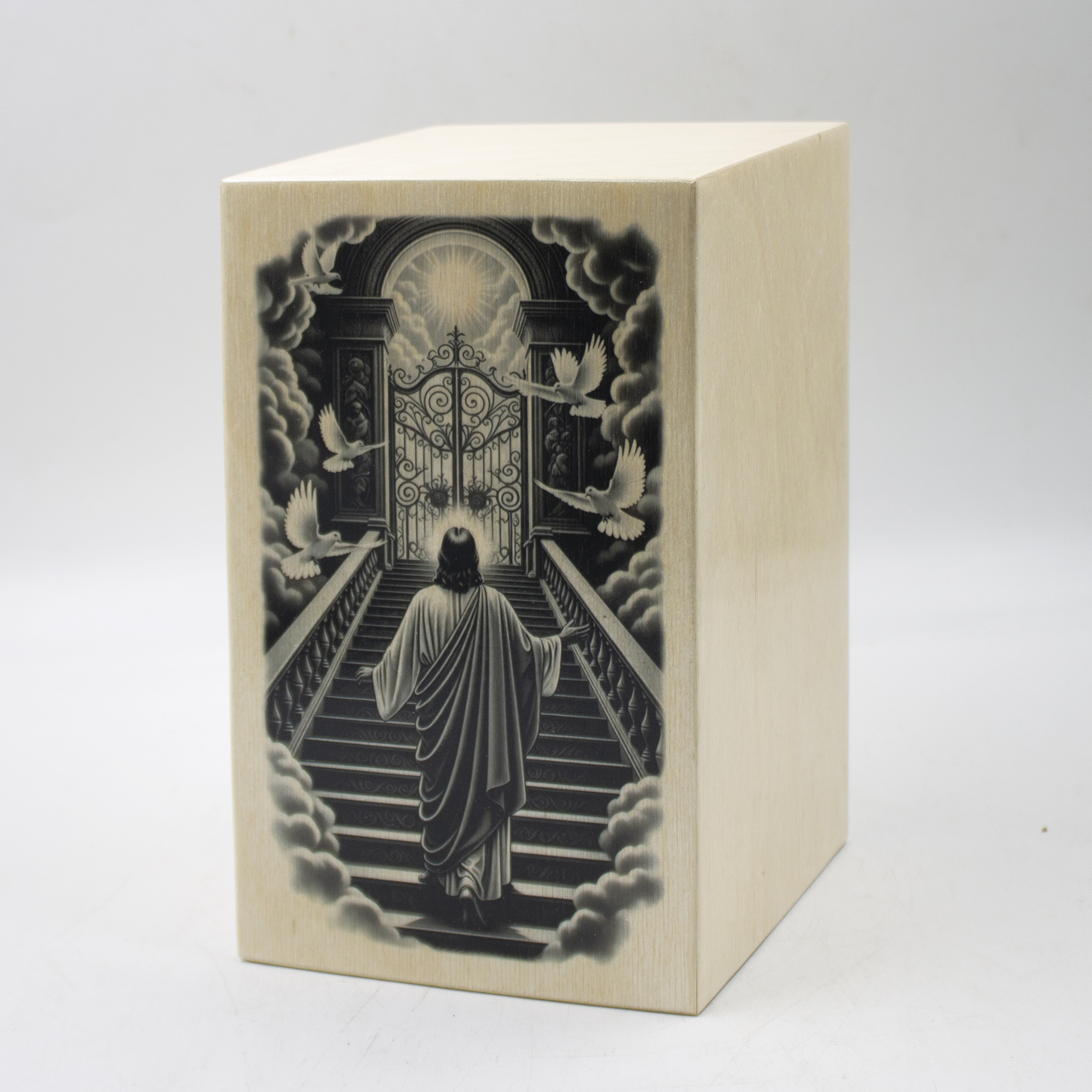 Урна для праха из натурального дерева в форме прямоугольной колонны с декоративной печатью "Врата Рая".