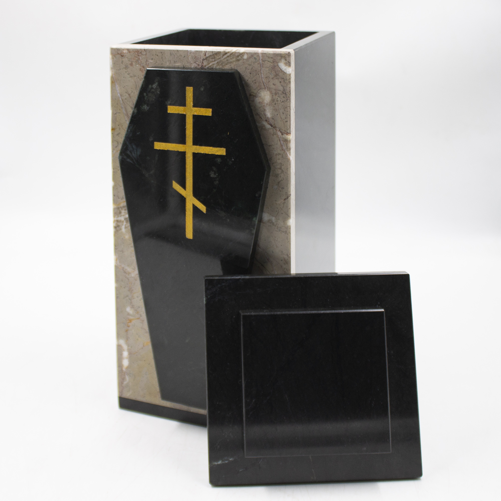 Урна для праха из бежевого мрамора и доломита с ритуальной символикой.