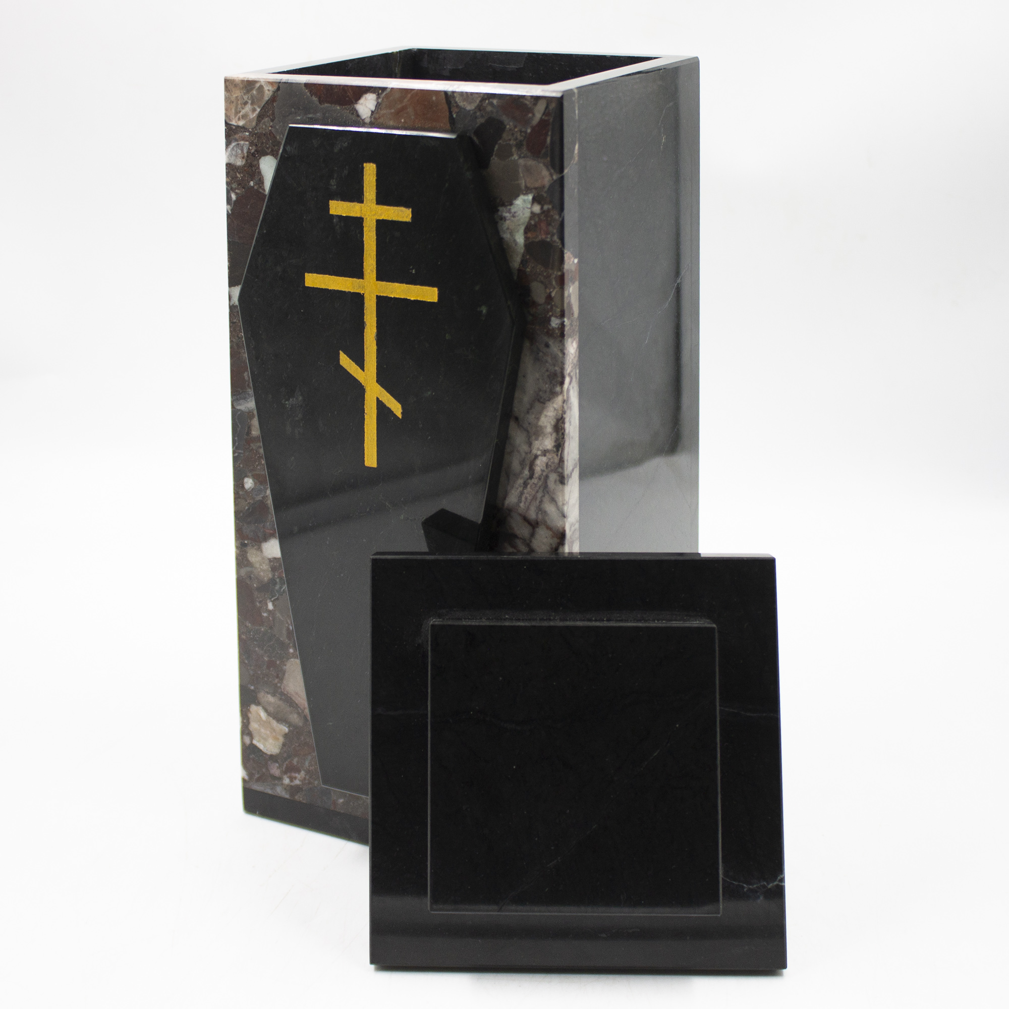 Урна для праха из конгломерата "мозаика" и доломита с ритуальной символикой.
