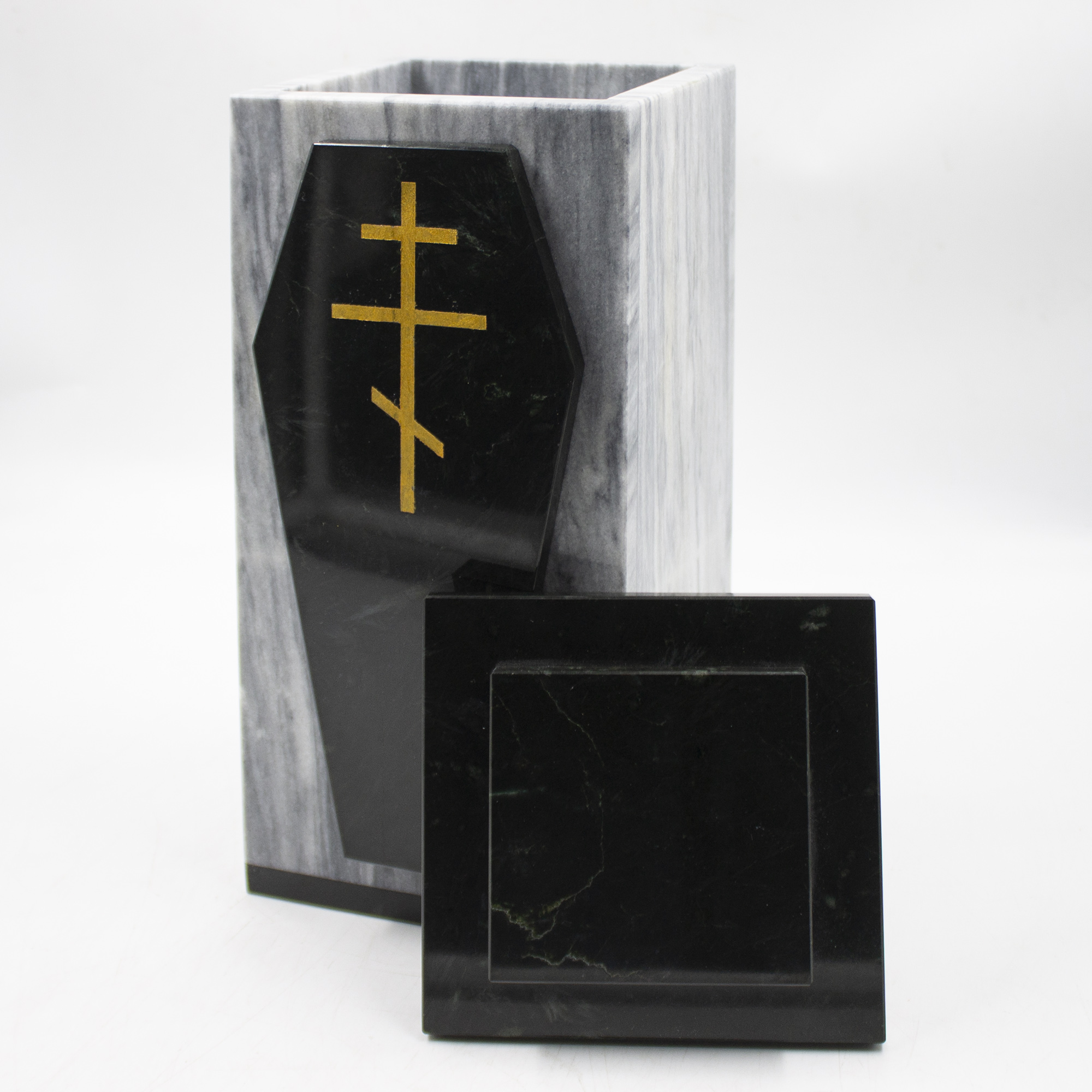 Урна для праха из серого мрамора и доломита с ритуальной символикой.