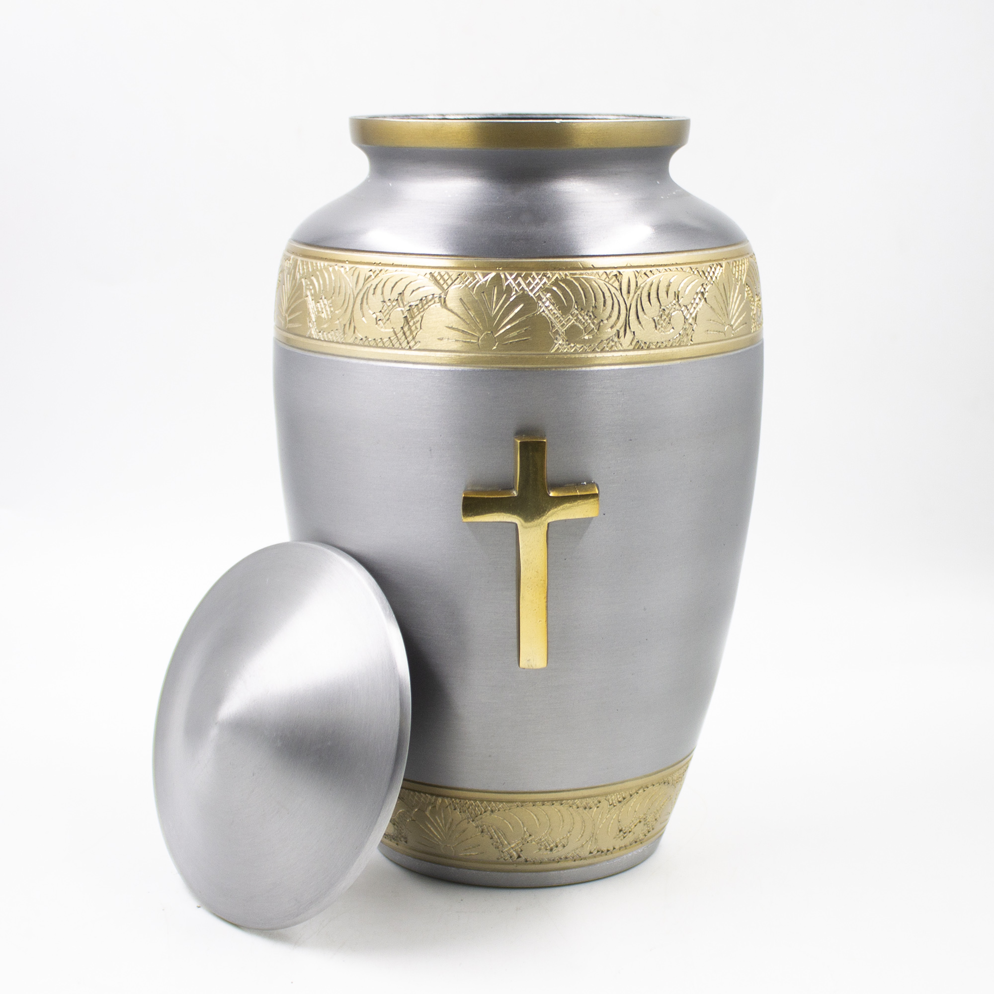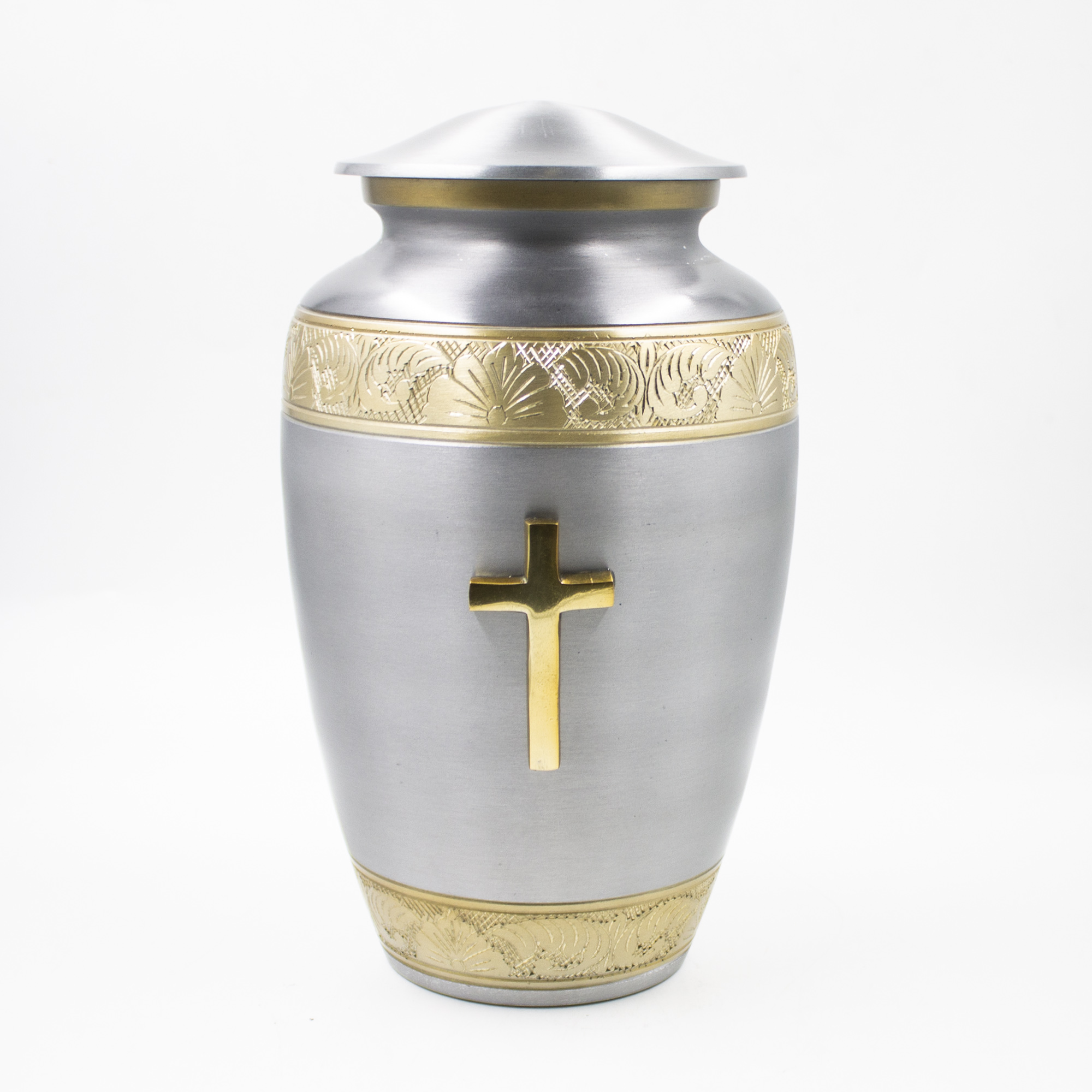 Урна для праха металл с гравировкой "Жемчуг с крестом" серебро-золото