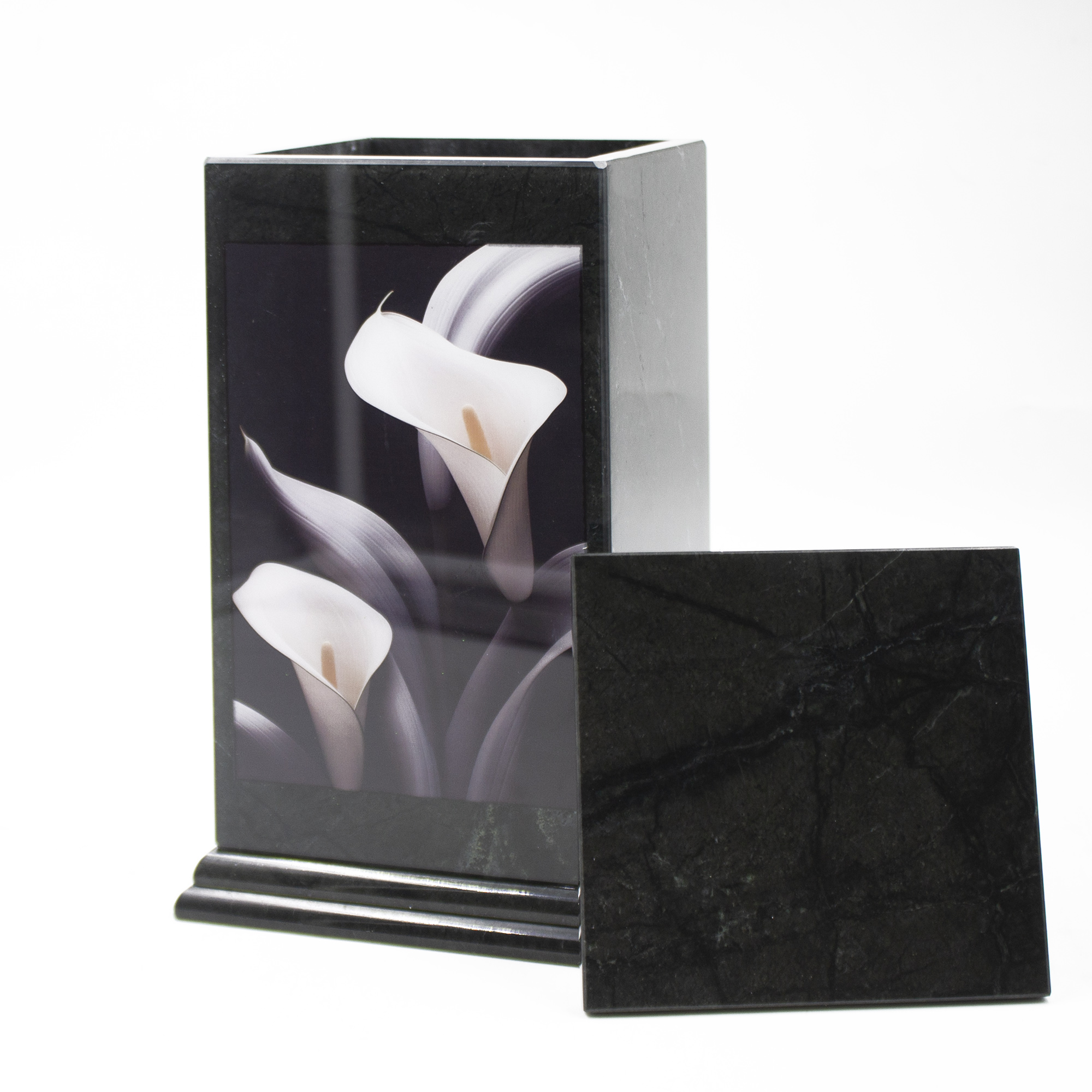 Погребальная урна с лаконичным дизайном и изяществом полированного доломита, с цветной печатью.