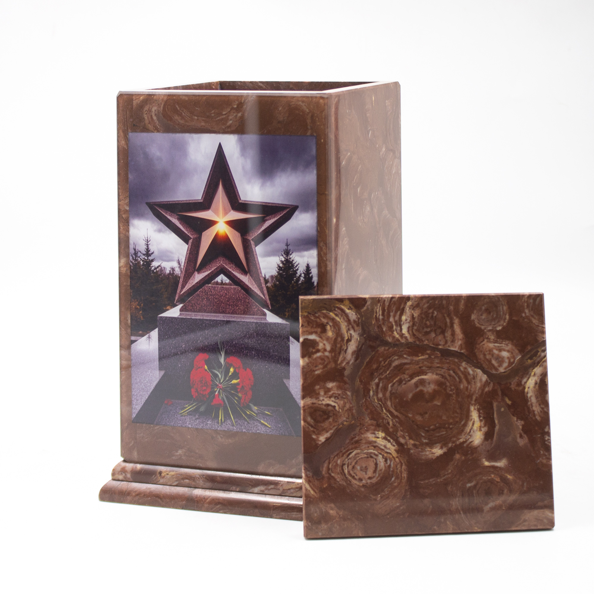 Погребальная урна с лаконичным дизайном и изяществом полированного креноида, с цветной печатью.