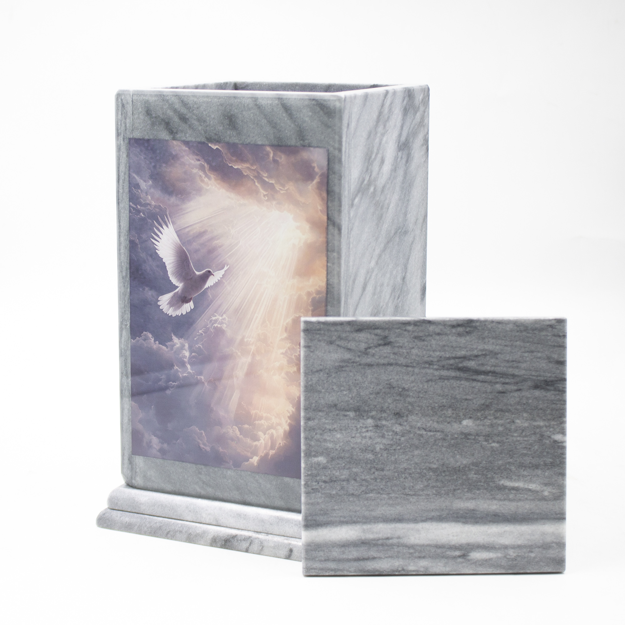 Погребальная урна с лаконичным дизайном и изяществом полированного серого мрамора, с цветной печатью.