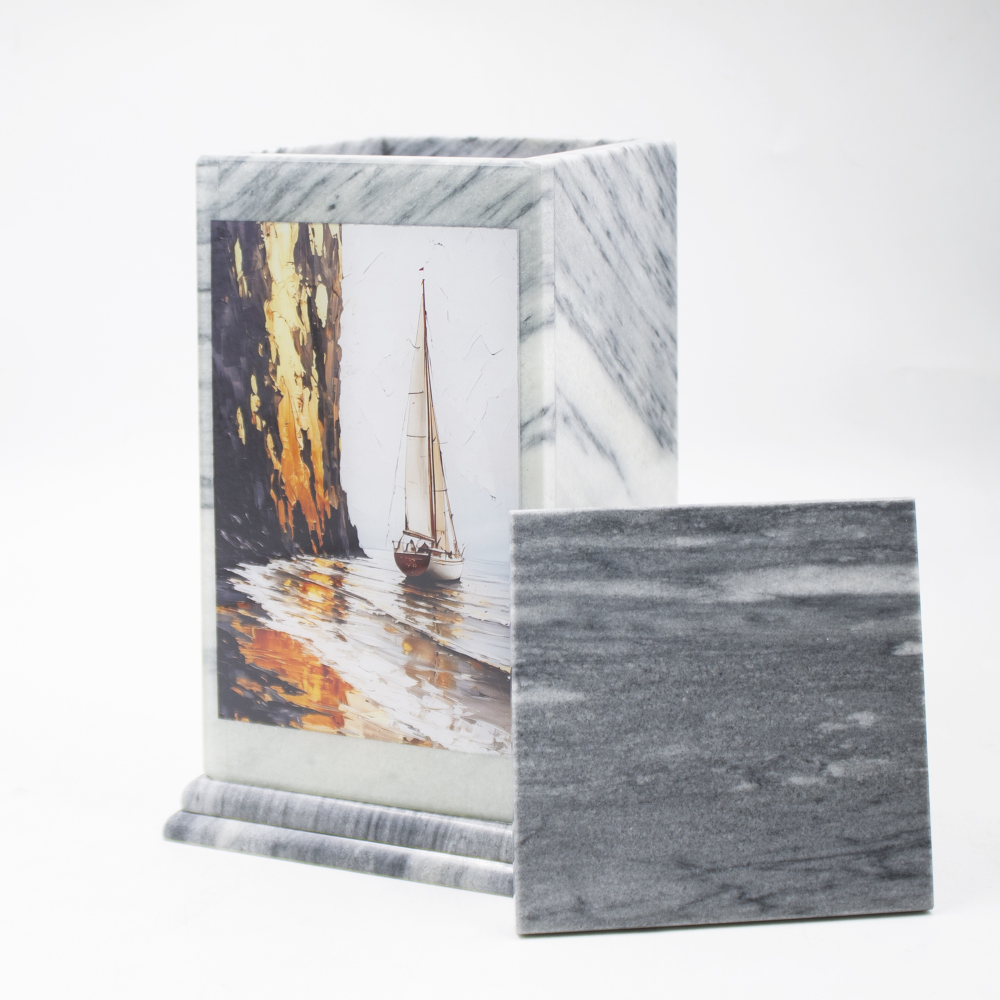 Погребальная урна с лаконичным дизайном и изяществом полированного серого мрамора, с цветной печатью.