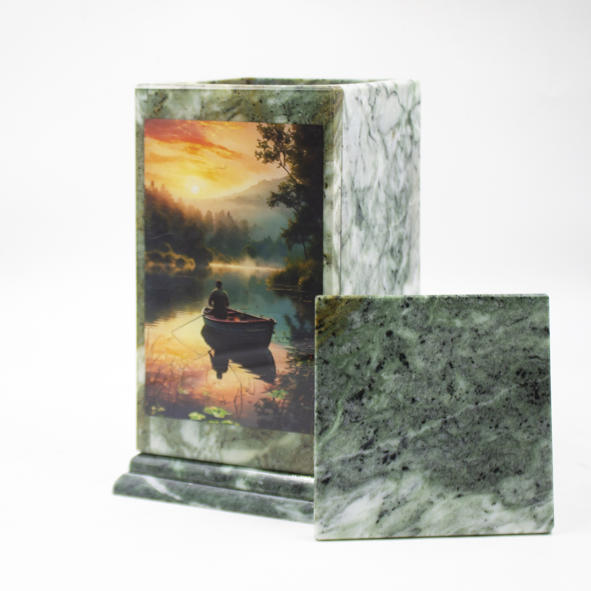 Погребальная урна с лаконичным дизайном и изяществом полированного змеевика, с цветной печатью.