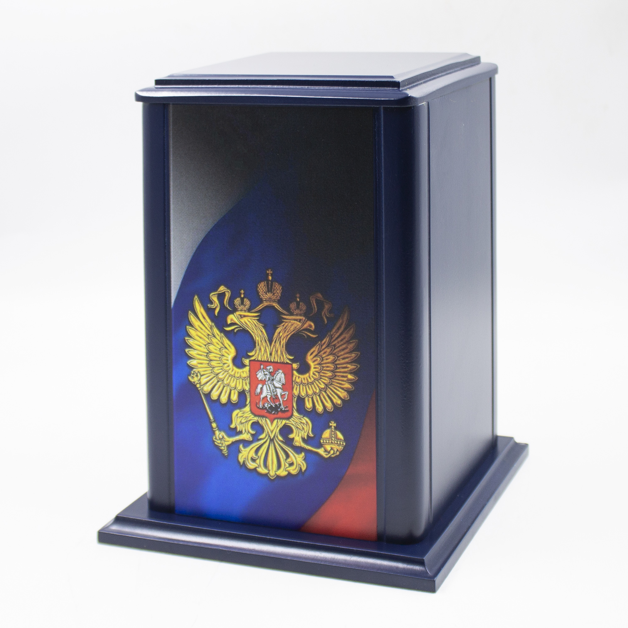 Урна для праха из натурального дерева в форме прямоугольной колонны с декоративной цветной печатью.